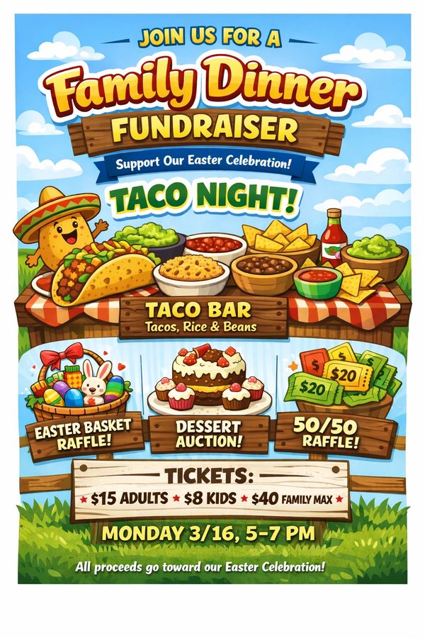 🌮 Family Dinner Fundraiser – Taco Night! 🌮 Join us for a family-friendly Taco Night Fundraiser as we raise funds for our upcoming Easter Celebration! This is a great opportunity to gather together, enjoy a delicious meal, and support a fun event for our kids. 📍 Event Details 📅 Monday, March 16 ⏰ 5:00–7:00 PM 🍽️ Taco Bar Dinner (tacos, rice & beans) 🎉 What’s Included 🌮 Taco dinner for the whole family 🎟️ Easter Basket Raffle 🍰 Dessert Auction 💰 50/50 Raffle 🎟️ Ticket Pricing $15 Adults $8 Kids $40 Family Max 👉 All proceeds directly support our Easter Celebration, including activities, prizes, and fun for the kids! Bring your appetite, invite your friends, and help us make this year’s Easter celebration extra special 💛